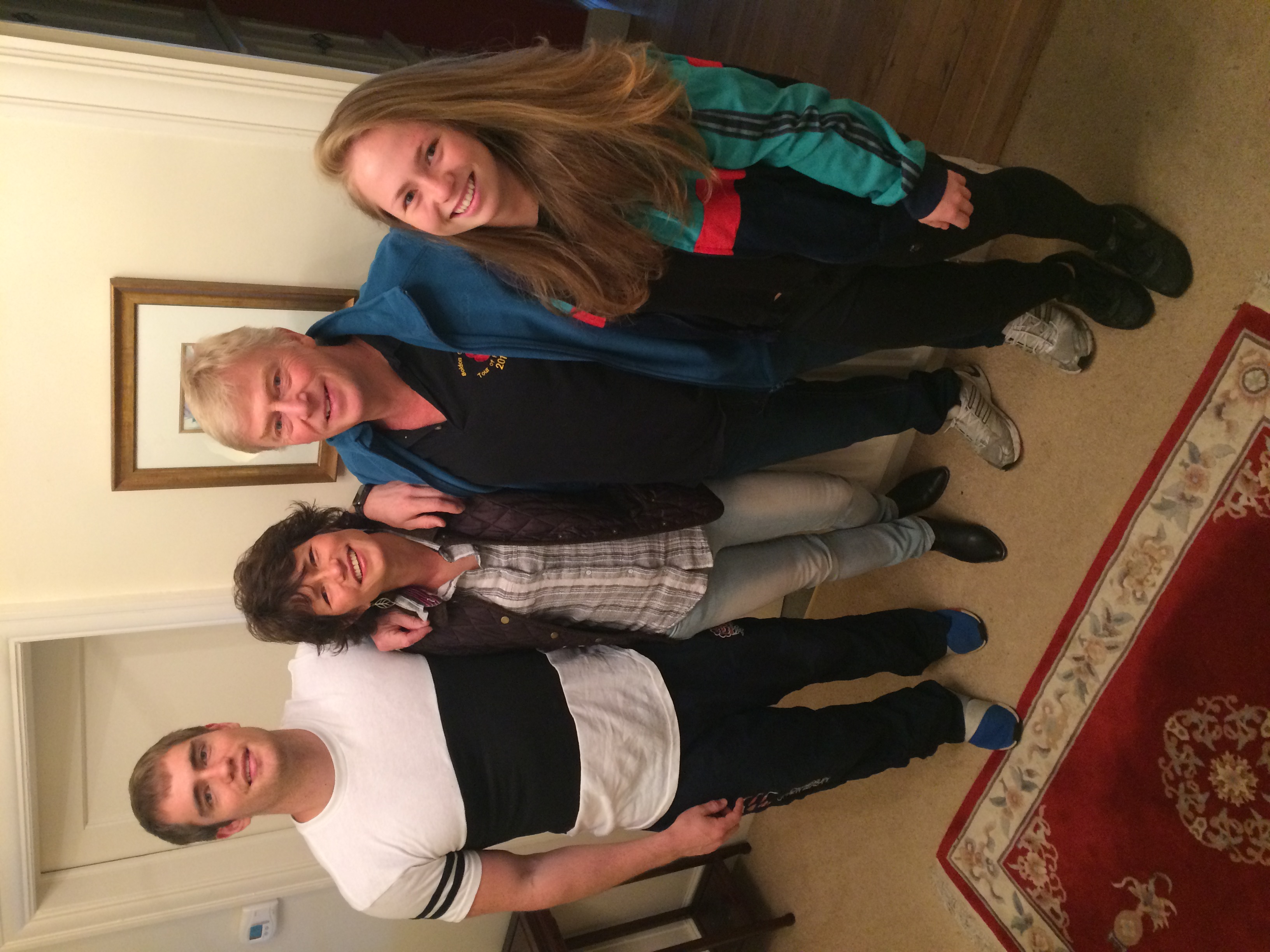 There will be changes at home too – only 1 of 4 children left at home! Sarah, our third is about to go up the road to study English and History at York Uni. She loves acting and directing and in her gap year has worked in various local theatres so wanted to study in York enabling her to keep these jobs going. Her two older brothers are also no strangers to the stage. Andrew is at Trinity Laban Music College training to be a Tenor and hoping to be a professional singer. Stephen, the eldest is a fifth year medic at Cambridge and is one of the writers/performers in the annual medics review.(Stephen and Andrew seen in the photos with their partners of 7 years) Peter (14, seen in the photo sharing the FA trophy glory with York city football club where we ares season ticket holders) is only too ready to remind me that I am the oldest Mum at school!. He is kept company by Milly, our somewhat crazy Border collie.